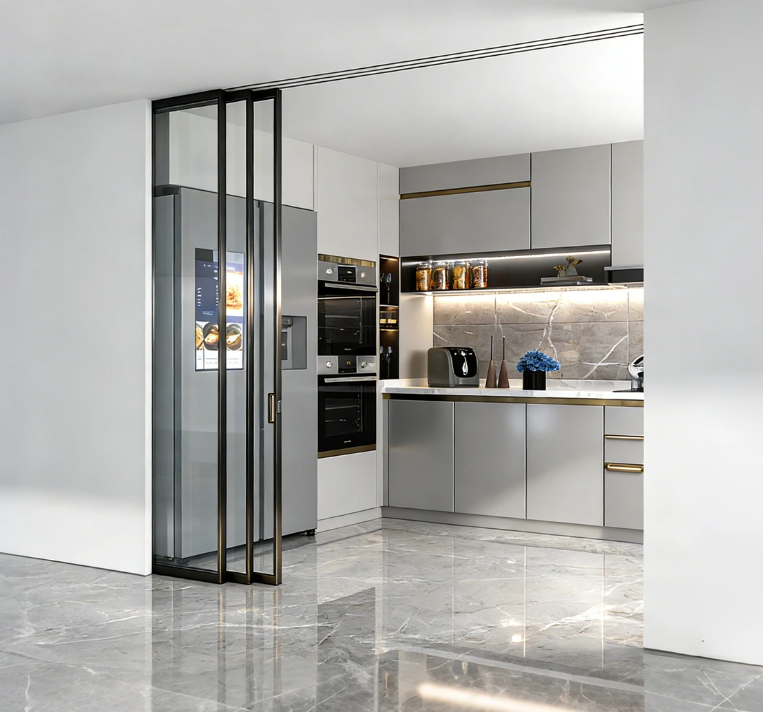 Trackless Floor Design: The top-hung sliding door system eliminates floor tracks, preventing dust buildup and keeping interior floors clean and visually seamless.